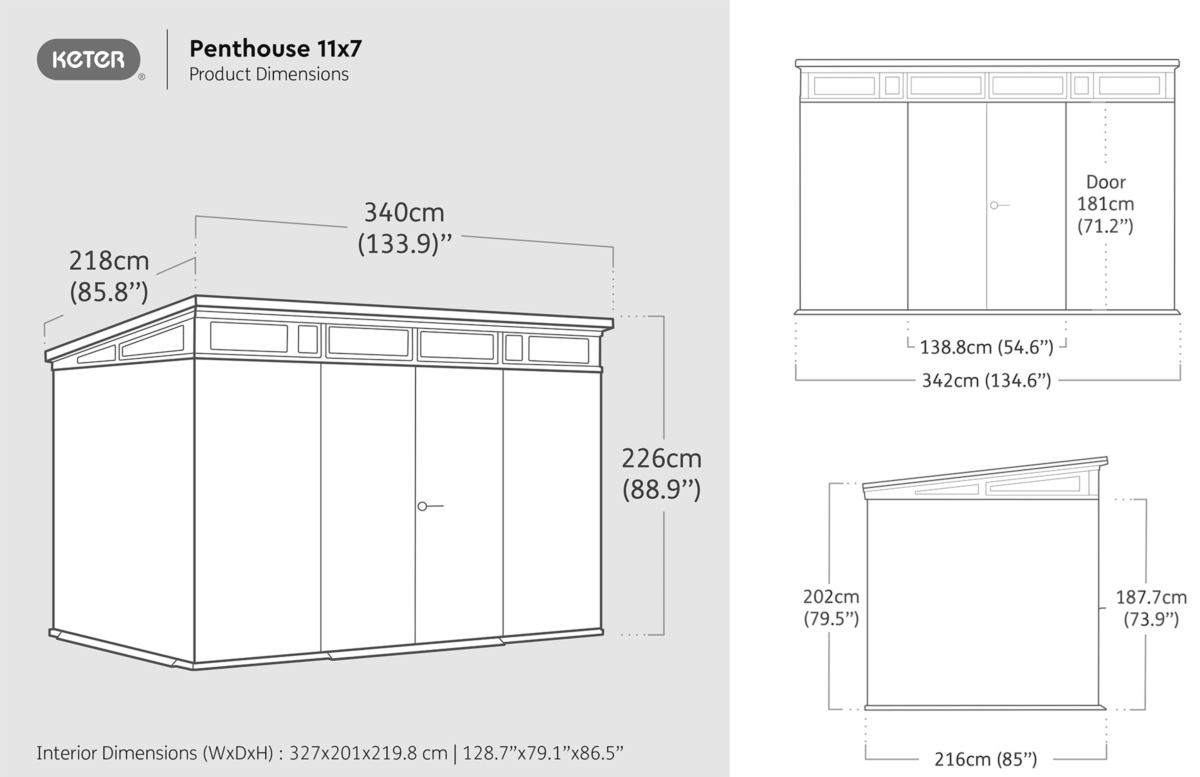 Domek narzędziowy PENTHOUSE 11x7 Grey z kolekcji Signature Collection firmy Keter to idealne rozwiązanie dla tych, którzy poszukują praktycznego i stylowego dodatku do swojego ogrodu. Jego nowoczesny design, wyróżniający się skośnym dachem i pasmem dużych okien, czyni go nie tylko funkcjonalnym miejscem do przechowywania, ale także dekoracyjnym elementem, który przyciągnie uwagę każdego.