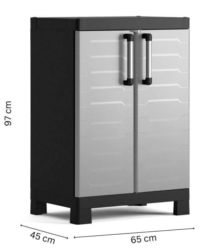 Niska szafa Detroit to doskonałe rozwiązanie dla osób, które chcą zorganizować przestrzeń w garażu, warsztacie, pralni lub innych pomieszczeniach o ograniczonej powierzchni. Dzięki kompaktowym wymiarom idealnie sprawdza się w niewielkich wnętrzach, oferując jednocześnie dużo miejsca do przechowywania. Jej solidna konstrukcja wykonana z wysokiej jakości polipropylenu zapewnia wyjątkową trwałość oraz odporność na uszkodzenia mechaniczne i warunki atmosferyczne, co gwarantuje wieloletnie, bezproblemowe użytkowanie.