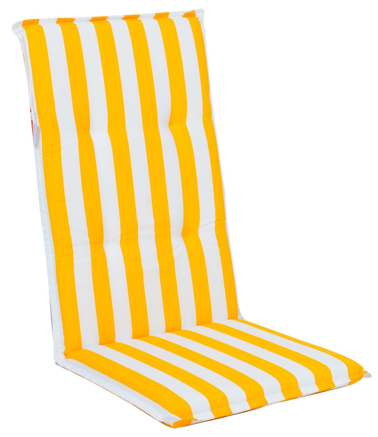 Poduszka ACA na klasyczne krzesło z wysokim oparciem poprawi komfort odpoczynku. Wzór 506-03 to biało-żółte pasy. Dodatkowego uroku dodają pikowania – 4 na oparciu oraz 2 na siedzisku. Owinięcie pianki PUR watą poliestrową sprawia, że poduszka jest puszys