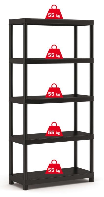 Cały regał to 5 półek, które zniosą ciężar aż do 55 kg każda. Zaletą