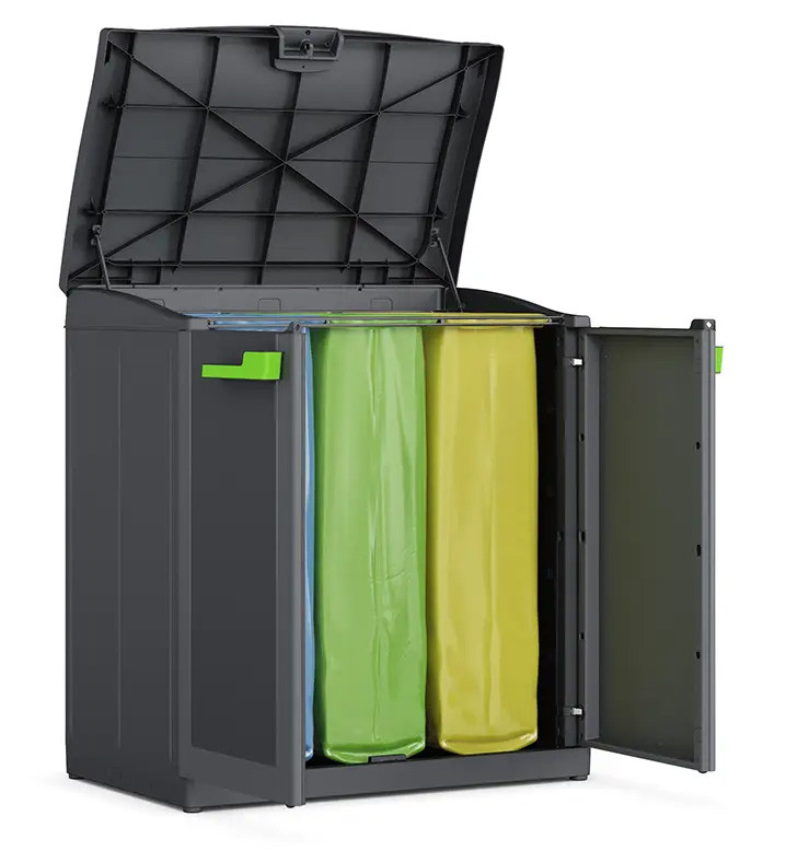 Szafa wyposażona jest w pokrywę, którą za sprawą wyprofilowanego uchwytu możesz jedną ręką podnieść do góry. W taki sposób łatwo wyrzucić śmieci od odpowiedniej części. Gdy będziesz potrzebować wymienić worki to wystarczy, że otworzysz przednie drzwiczki i w ten sposób szybko i wygodnie usuniesz zapełnione worki a założysz nowe. Drzwiczki wyposażone są w poręczne uchwyty. W celu zabezpieczenia wnętrza szafy np. przed zwierzętami lub małymi dziećmi możesz dokupić i zamontować kłódkę.